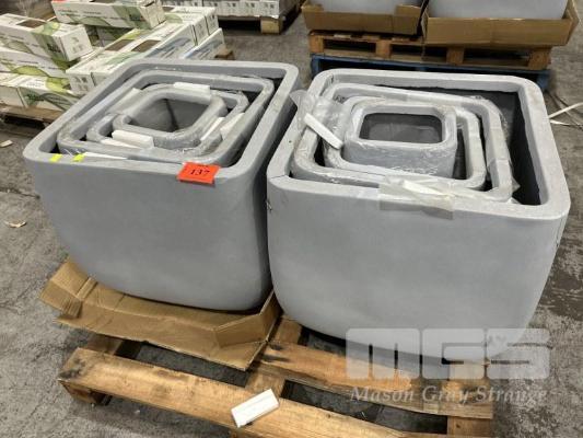 2 x SETS OF 4 CONTEMPORARY PLANTER POTS COLOUR: GREY, ***NOTE 1 SET IS DAMAGED & CRACKED, SEE PHOTOS*** 1 @ 490mm (H) 1 @ 390mm (H) 1 @ 300mm (H) 1 @ 200mm (H)