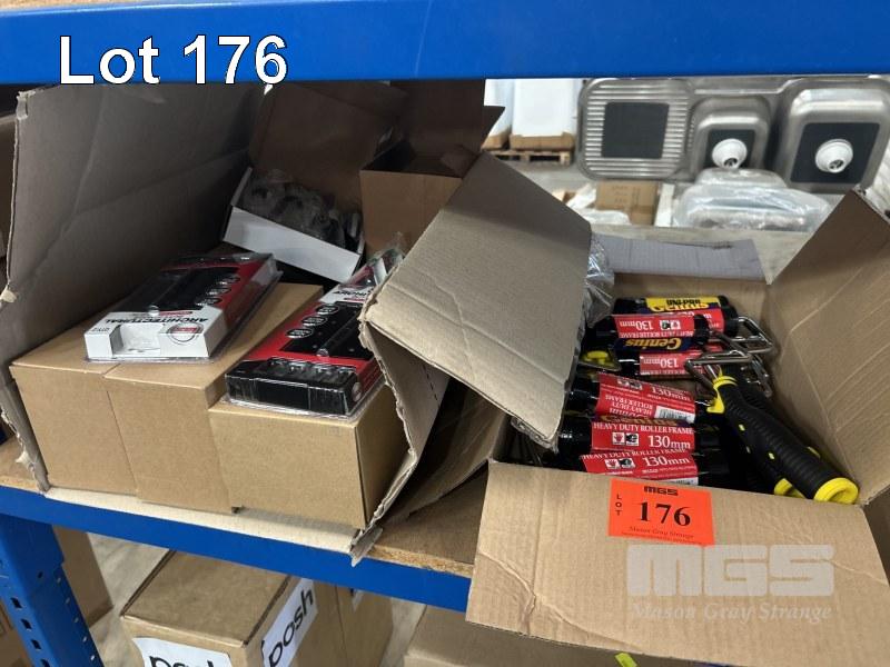 ASSORTED HINGES, DOOR STOPS & PAINT ROLLERS (2 x BOXES)