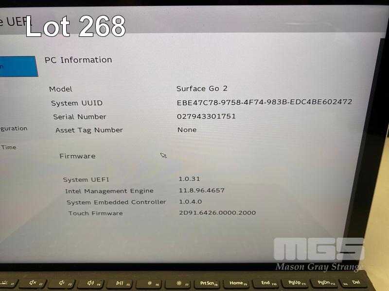 TABLET PC, MICROSOFT SURFACE GO 2, MODEL 1901, PENTIUM GOLD 4425Y @ 1.7GHz, 8GB DDR3 RAM, 128GB NVMe M.2 SSD, 10" TOUCHSCREEN (1800x1200), INTEL UHD GRAPHICS 615, Wi-Fi, BLUETOOTH, WINDOWS 10 PRO INSTALLED, KEYBOARD TYPE COVER & POWER SUPPLY (NOTE: MINOR DAMAGE TO CASING) S/N:027943301751