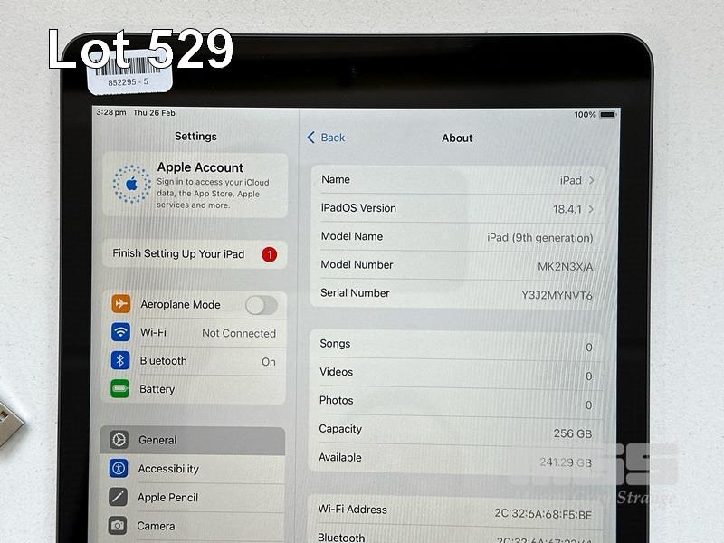 APPLE iPAD 9TH GEN, 256GB, Wi-Fi, SPACE GREY, MODEL MK2N3X/A, A2602 WITH CABLE (NO CHARGER) S/N:Y3J2MYNVT6