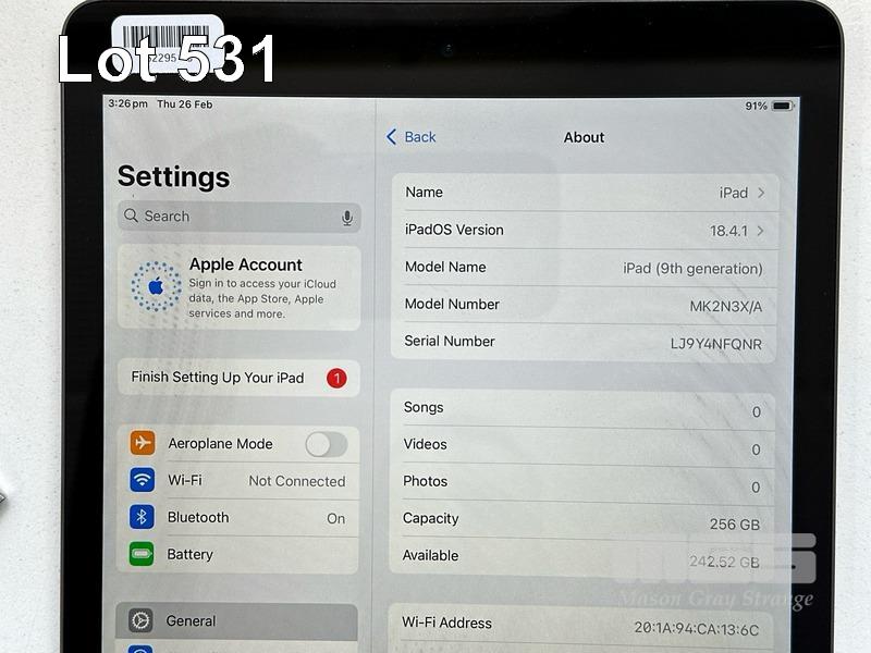 APPLE iPAD 9TH GEN, 256GB, Wi-Fi, SPACE GREY, MODEL MK2N3X/A, A2602 WITH CABLE (NO CHARGER) S/N:LJ9Y4NFQNR