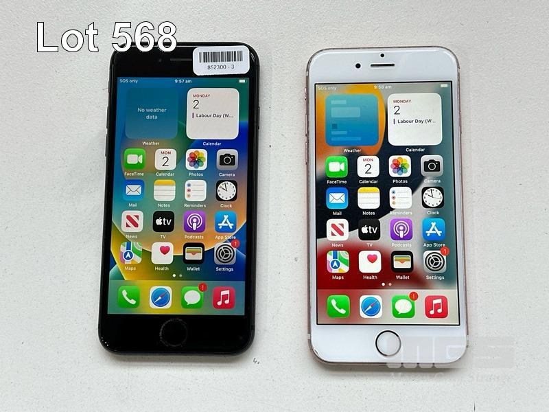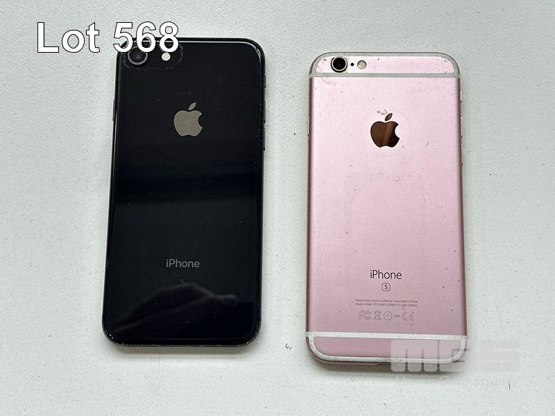 2 x APPLE iPHONES INC. - APPLE iPHONE 8, 64GB, MQ782J/A - APPLE iPHONE 6S, 64GB, MKQR2X/A (NOTE: BATTERY SERVICE MESSAGE, SCRATCHES ON SCREEN) (NO CABLES, NO CHARGERS) S/N:FFMYM1ZRJC6G, FK2R5KRGGRYF