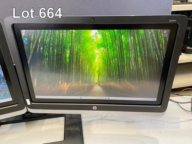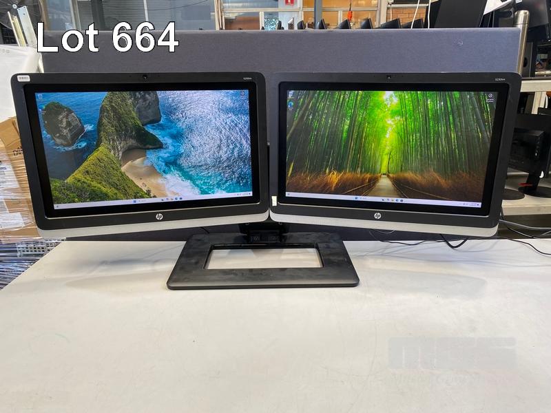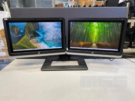 2 x MONITORS, HP ELITEDISPLAY S230tm 23" IPS TOUCHSCREEN, DISPLAYPORT, DVI (WITH CABLES) ON DUAL MONITOR STAND S/N:CNC6010017, CNC601001C