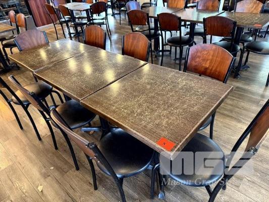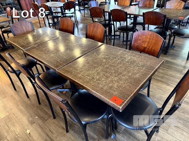 RESTAURANT DINING TABLE & CHAIR SETTING, 3 x RESIN TOPPED DINING TABLE, 700 x 700mm WITH SINGLE METAL PEDESTAL BASE & 8 x BLACK VINYL, TIMBER BACKED, STEEL FRAMED DINING CHAIRS