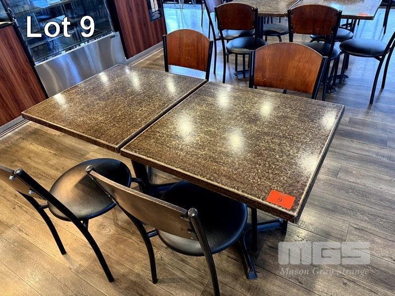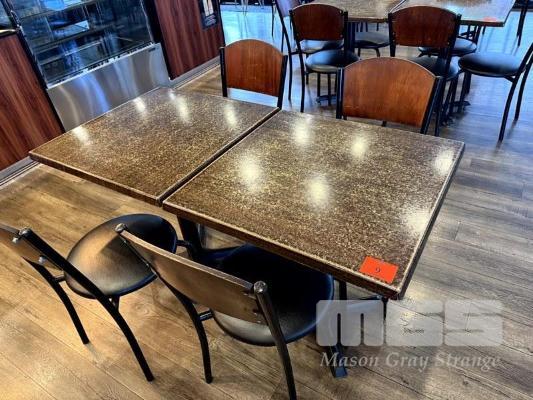 RESTAURANT DINING TABLE & CHAIR SETTING, 2 x RESIN TOPPED DINING TABLE, 700 x 700mm WITH SINGLE METAL PEDESTAL BASE & 4 x BLACK VINYL, TIMBER BACKED, STEEL FRAMED DINING CHAIRS