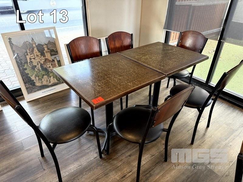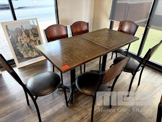 RESTAURANT DINING TABLE & CHAIR SETTING, 2 x RESIN TOPPED DINING TABLE, 700 x 700mm WITH SINGLE METAL PEDESTAL BASE & 6 x BLACK VINYL, TIMBER BACKED, STEEL FRAMED DINING CHAIRS