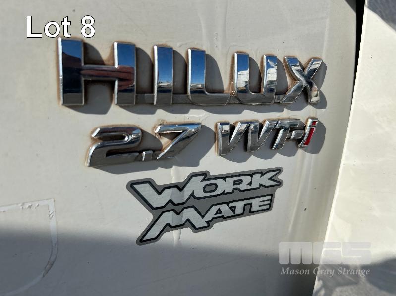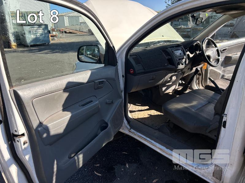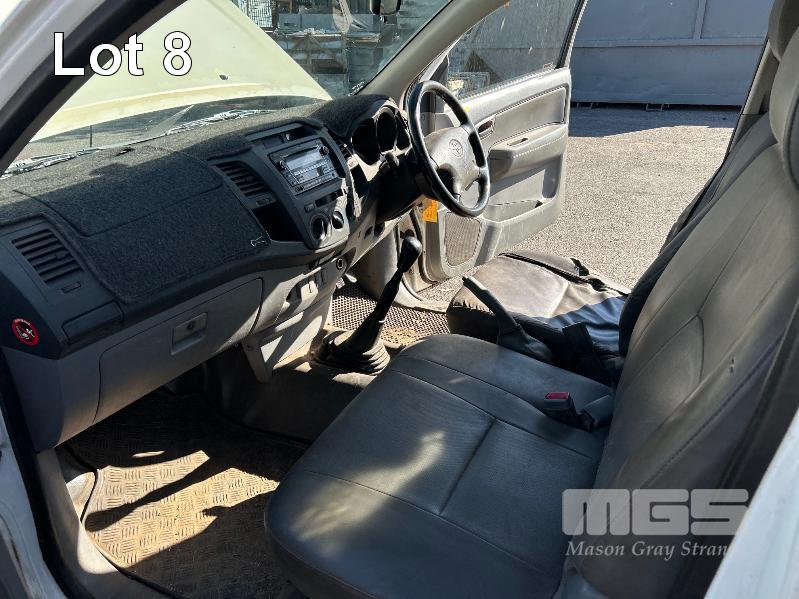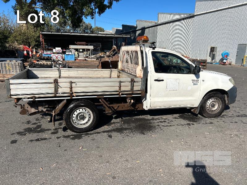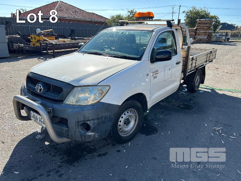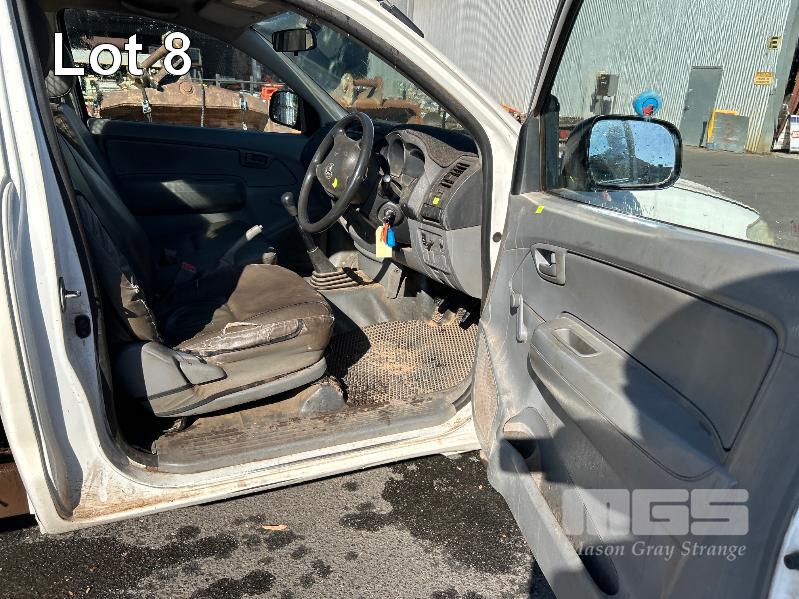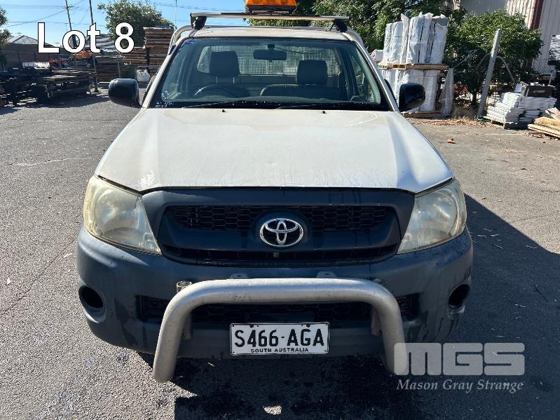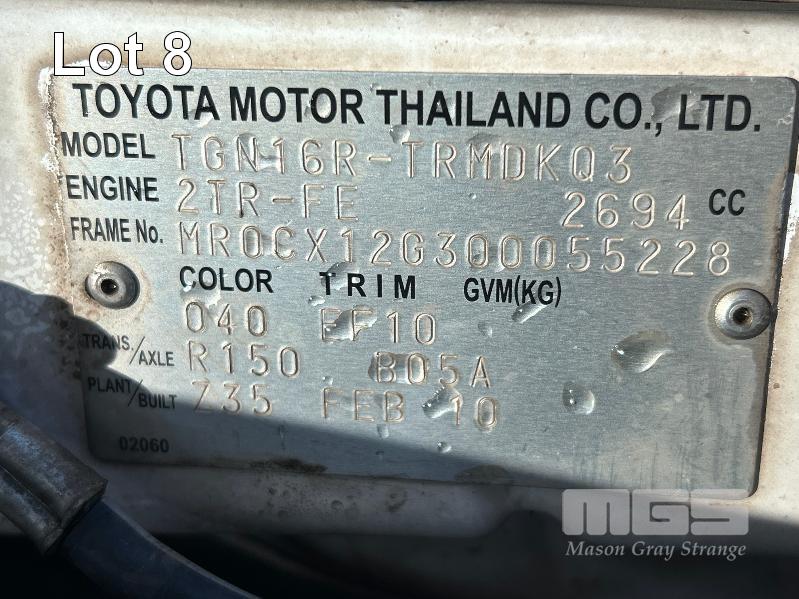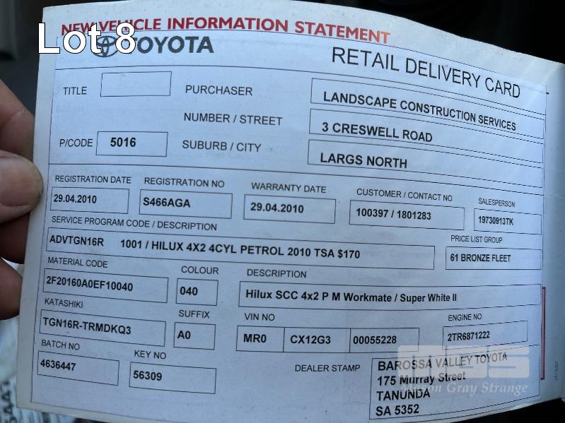 2010 TOYOTA WORK MATE TGN16R 150 SER SINGEL CAB TRAY TOP REG: S466 AGA VIN: MR0CX12G300055228 ENG: 2TR6871222 ODO: 264,680kms SHOWING 2.7 LITRE EFI, 5 SPEED MANUAL TRANSMISSION, WHITE DUCO, 2 DOORS, 3 SEAT, AIR BAG, AIR CON, ALLOY TRAY, CARGO BARRIER, CD PLAYER, NUDGE BAR, POWER STEERING, SPARE WHEEL, TOW BAR, KEY #9 (WITH 1 KEY/S, WITH OWNER'S MANUAL, WITH SERVICE BOOKS)