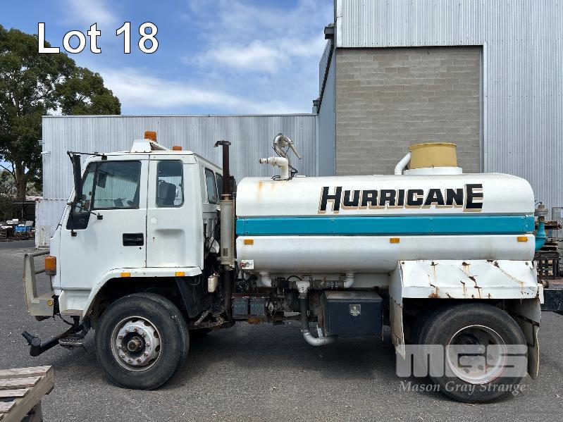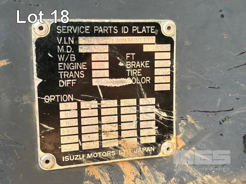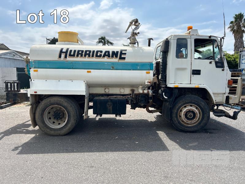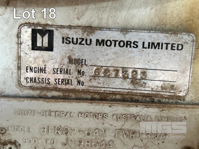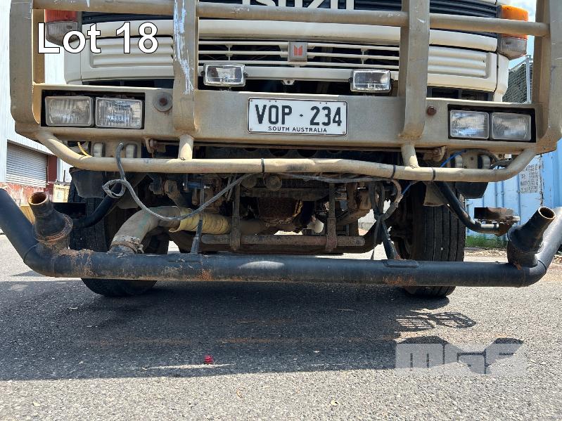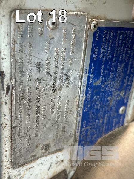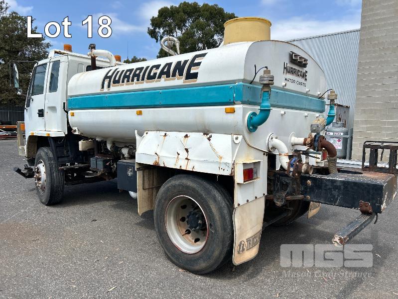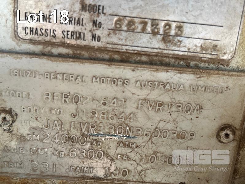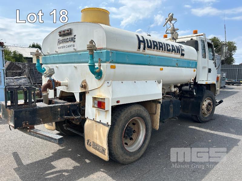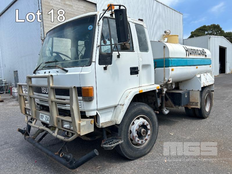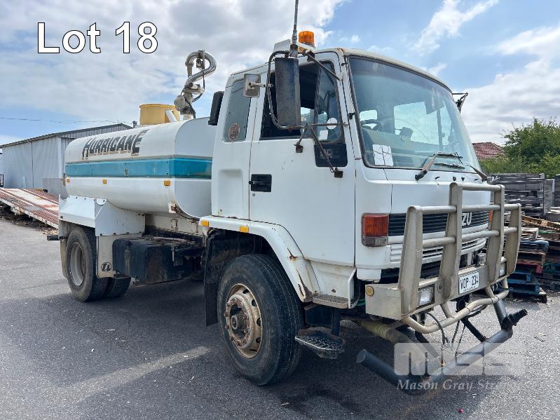 1994 ISUZU FUR900 LONG 4x2 WATER TRUCK REG: VOP 234 VIN: JALFVR13QN3600309 ENG: 627323 ODO: 668,764kms SHOWING GVM: 16,000kg GCM: 24,000kg 4 CYLINDER DIESEL, 5 SPEED MANUAL TRANSMISSION, SPRING SUSENSION, WHITE DUCO, 2 DOORS, 3 SEAT, BULL BAR, FROTN & REAR SPRAY BARS STEEL WATER TANK KEY #6 (WITH 1 KEY/S) CONDITION: DRIVE TRAIN - NO CLUTCH, CAN'T SELECT GEARS
