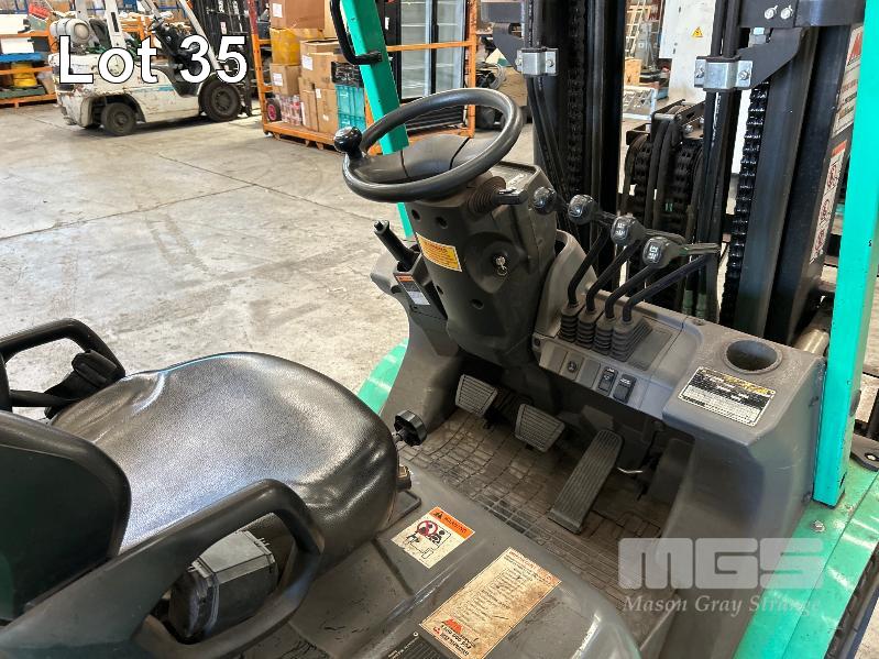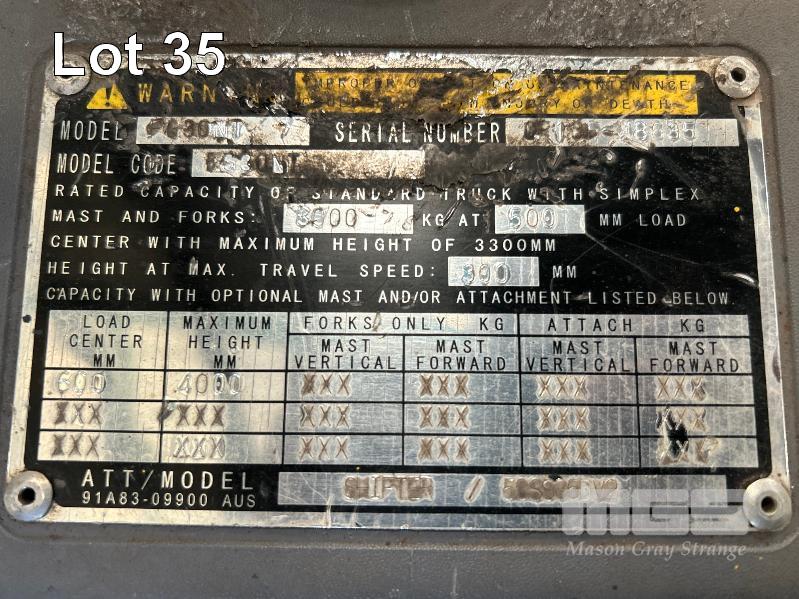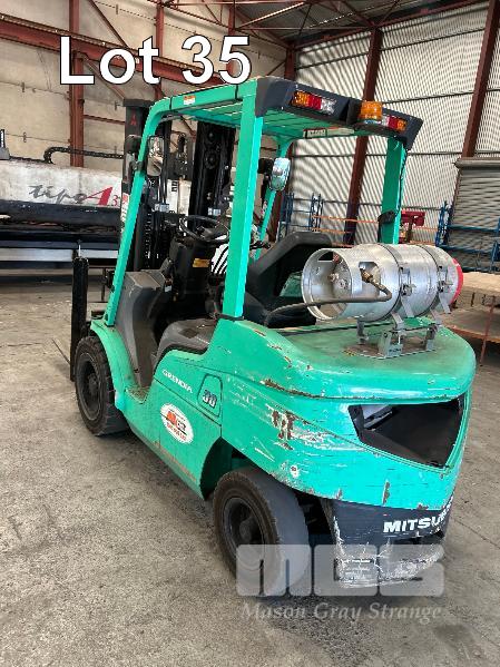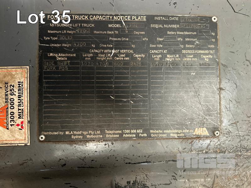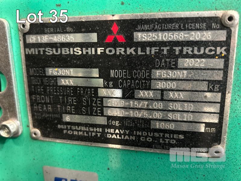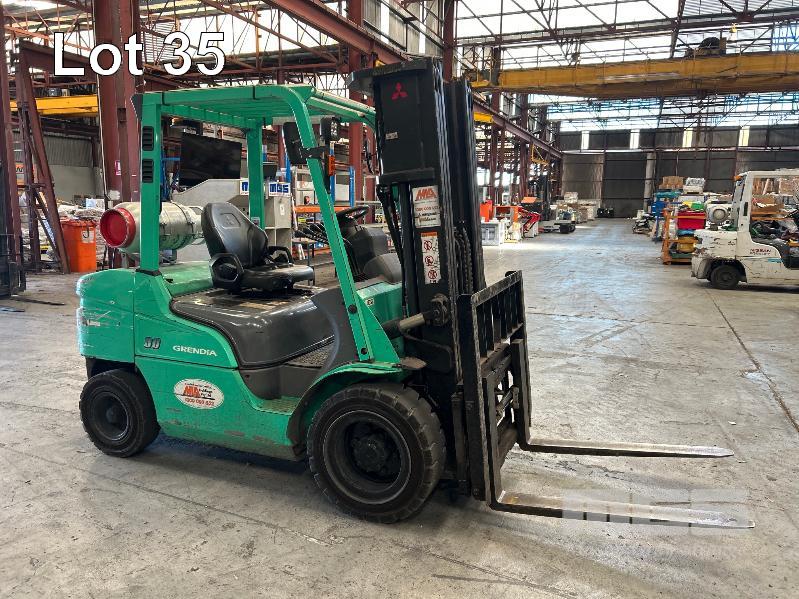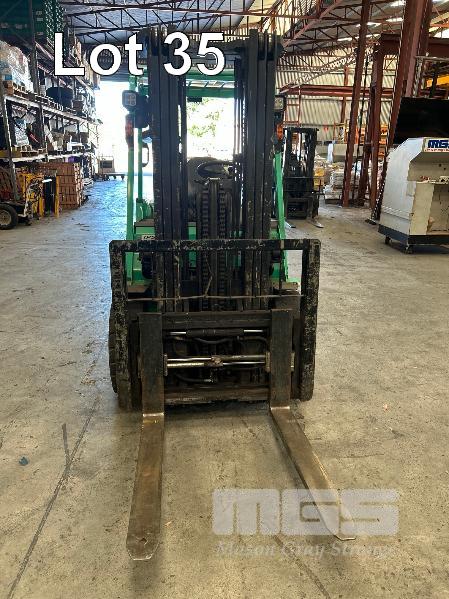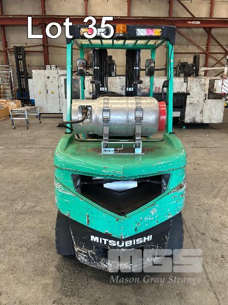 2022 MITSUBISHI GRENDIA FORKLIFT, 3T MOD: FG30NT S/NO: CF13F-48635 POWERED BY 4 CYLINDER, DUAL FUEL ENGINE HOURS: 1,925 SHOWING CONTAINER MAST, SIDE SHIFT & TYNE POSITIONING SOLID TYRES MAX LIFT HEIGHT: 4,700mm MAX LIFT CAP: 2,425kg KEY #41