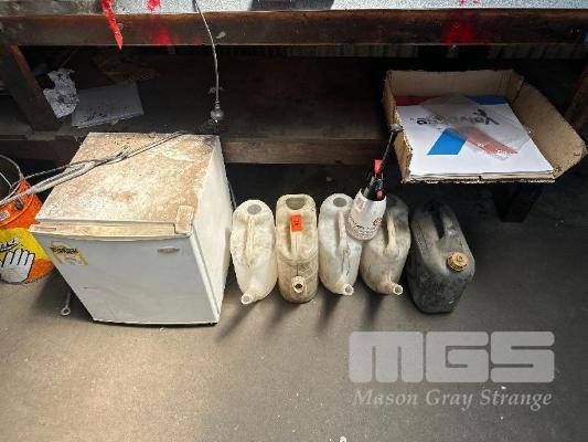 6 x POURERS, PUMP PACK, FUEL CONTAINER WITH 50 LITRE BAR FRIDGE & VALVOLINE FLOOR MATS