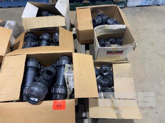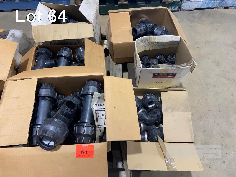 ASSORTED PLASSIM HP BLACK PLASTIC PIPE FITTINGS, 63-50-63 TEES, 50 x ELBOWS, M63-ADAPTORS 7 x CARTONS CONTENTS 1 x PALLET