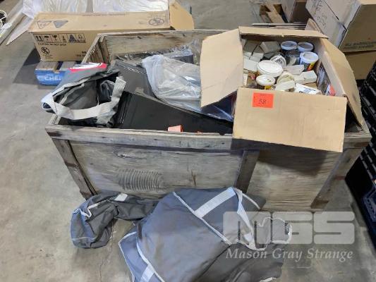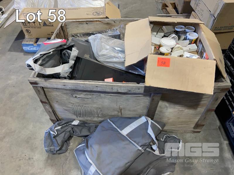 ASSORTED BBQ SPARES INCLUDING END PLATES, MORTAR, MESH PANELS, BRIQUETTES, CONTENTS OF CRATE & BIN (NOT INCLUDING CRATE/BIN)