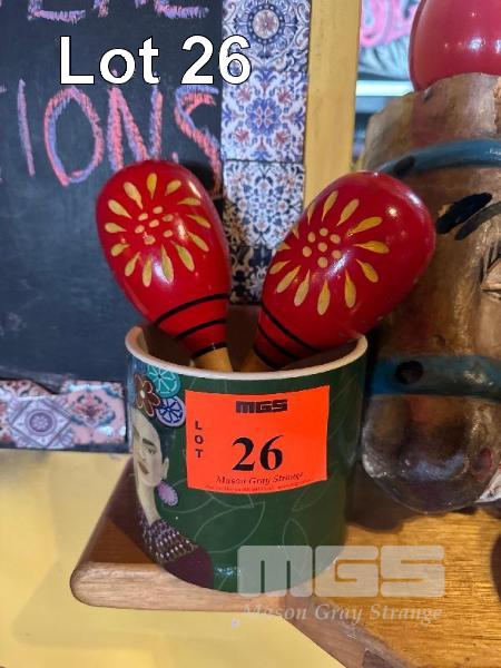 PAIR WOODEN MARACAS, CERAMIC POT & TIMBER MASK