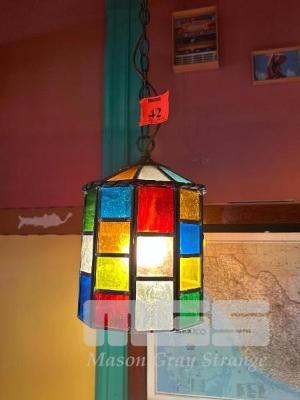 PAIR VINTAGE PENDANT LEADLIGHTS, GLASS SHADE, 200 x 300mm, 1200mm CHAIN, 240V, 10 AMP PLUG