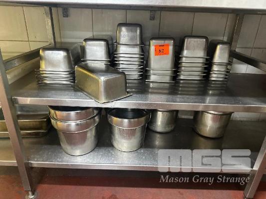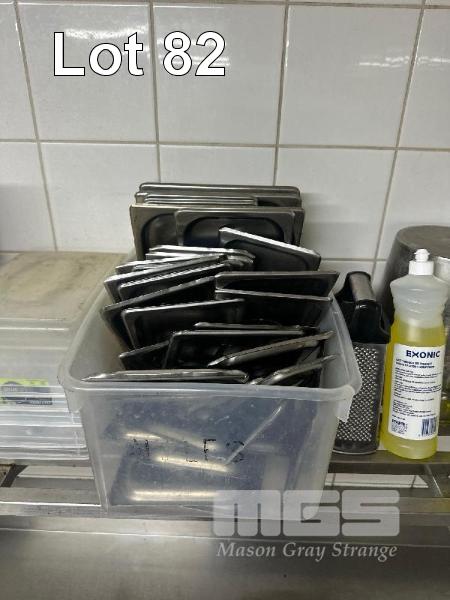 35 (APPROX) x ASSORTED GASTRONORM TRAYS WITH LIDS, 10 x PVC TUBS, KNIVES, KITCHEN SUNDRIES, 6 x ICE BUCKETS, ETC