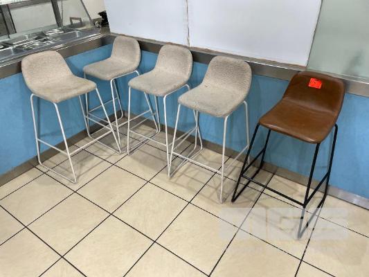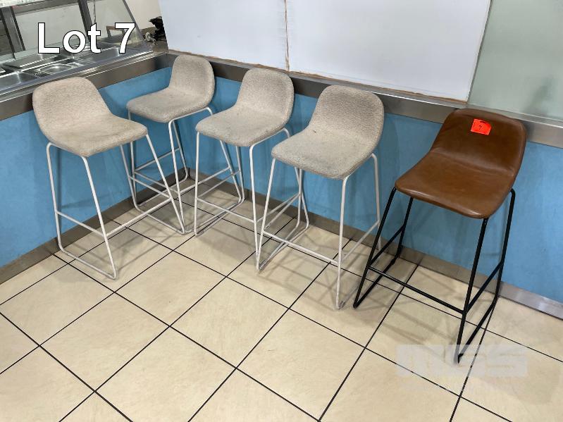 4 x GREY CLOTH BAR STOOLS & 1 x BROWN VINYL BAR STOOL