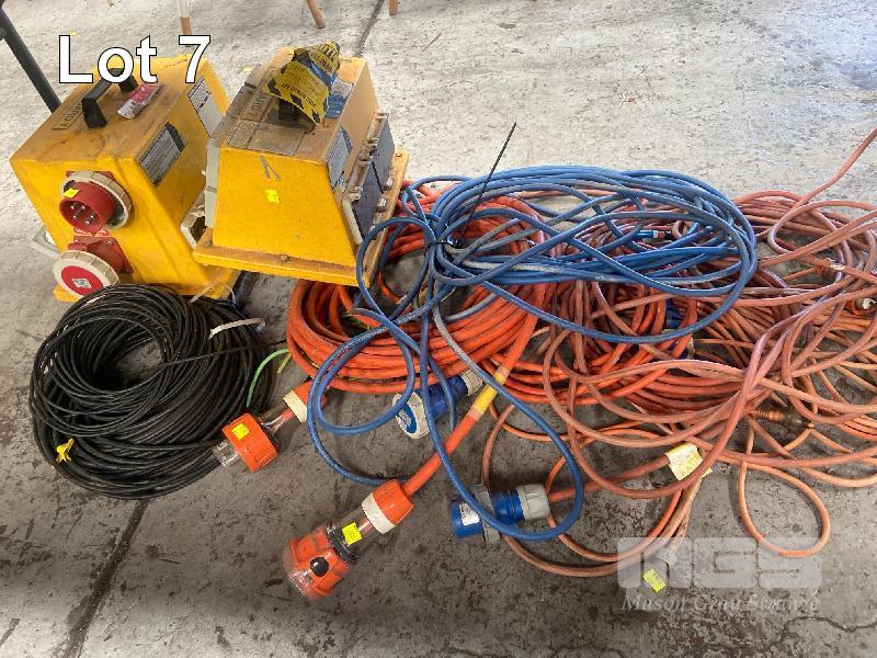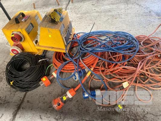 ASSORTED EXTENSION LEADS, 240/415V, GAUGES & ANTI SLIP TAPE, AIR HOSE FITTINGS, ETC 1 x TABLE & UNDER TABLE