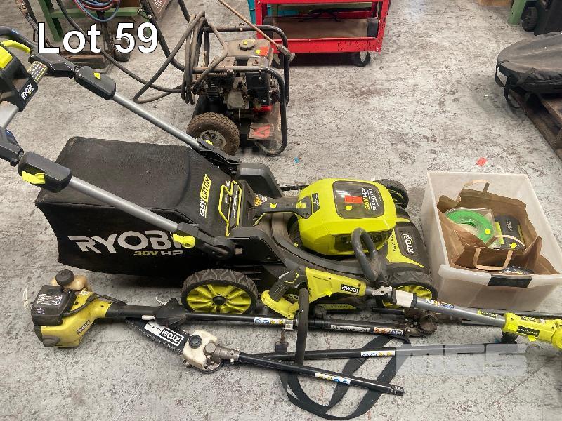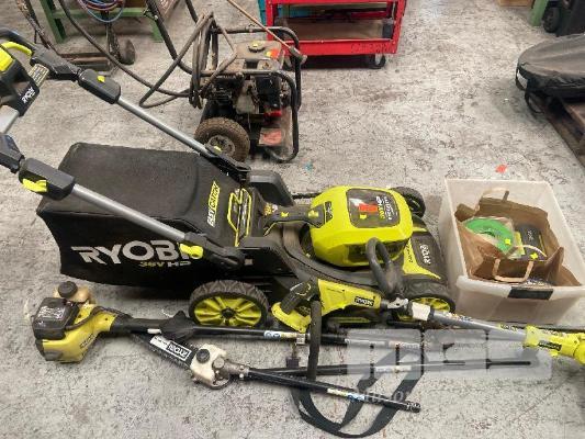 SELF PROPELLED MOWER, RYOBI 36HP WITH BATTERY, CHARGER & CATCHER WITH LINE TRIMMER