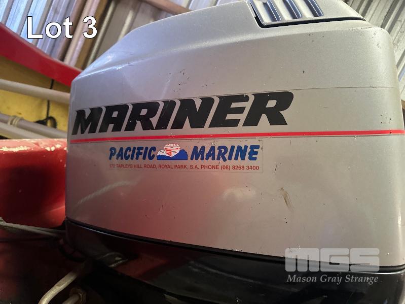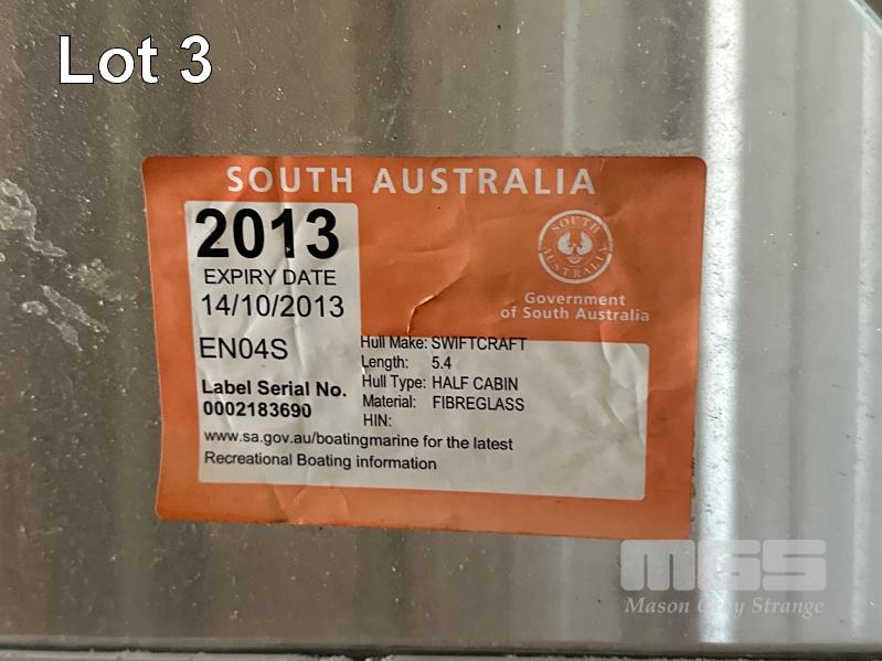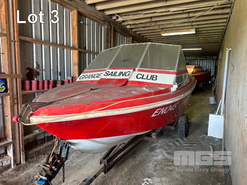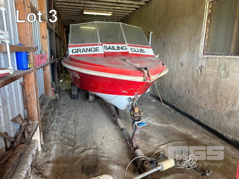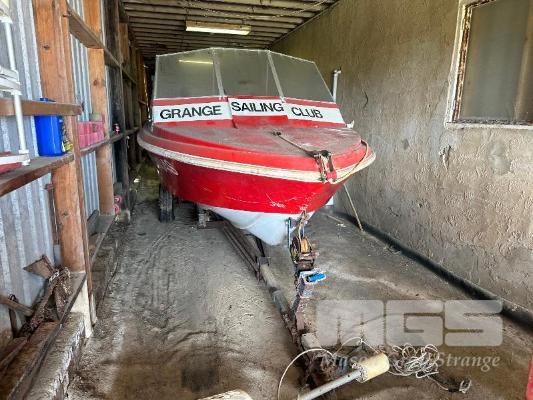 SWITCHCRAFT TENDER BOAT, 5.4M MODEL: ES04S FIBERGLASS, HALF CAB 75hp MARINER OUTBOARD MOTOR (DONATED BY DARRYL BARRET IN 1980) ON BOAT TRAILER, NOT ROAD WORTHY