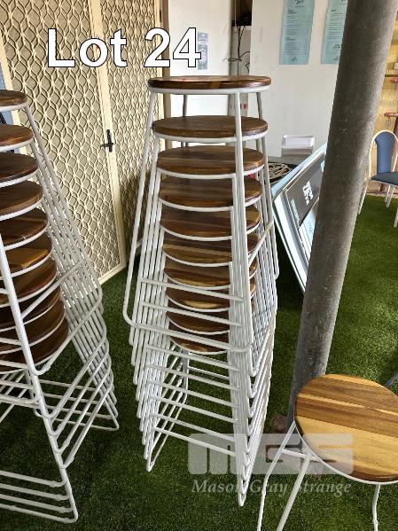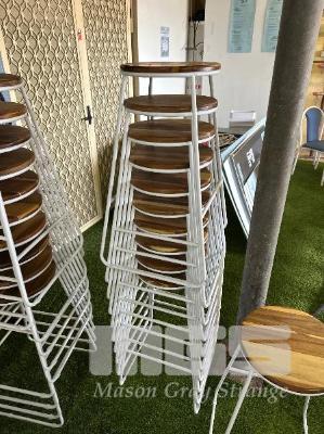 12 x TIMBER TOP BAR STOOLS, WHITE STEEL FRAME, STACKABLE, 700mm
