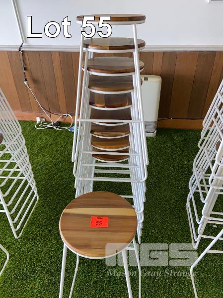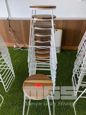 10 x TIMBER TOP BAR STOOLS, WHITE STEEL FRAME, STACKABLE, 700mm
