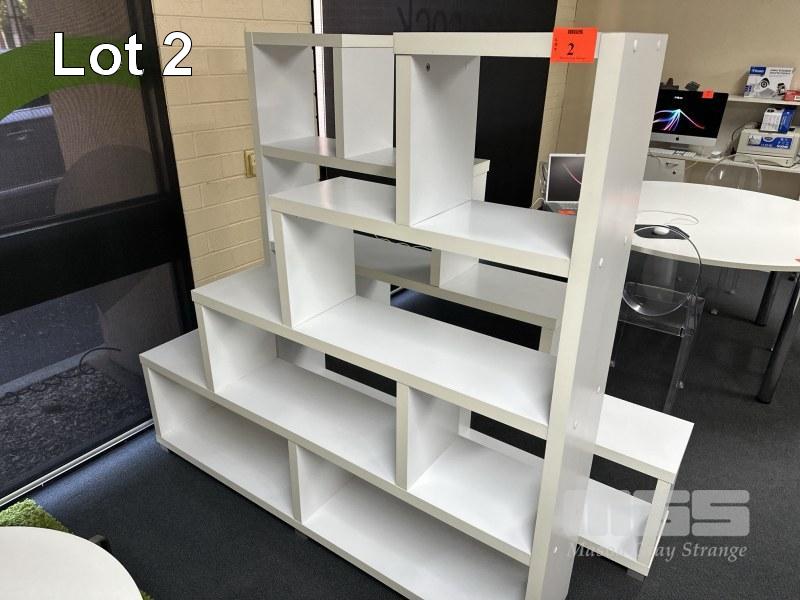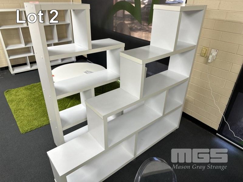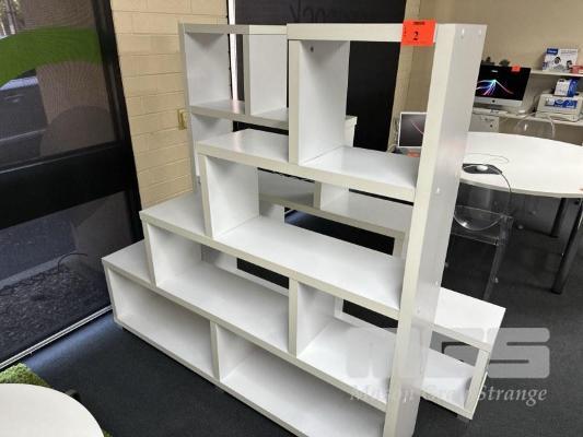 2 x STAIR BOOKCASES, WHITE LAMINATE, EACH 155 (H) x 160 (W) x 30cm (D)