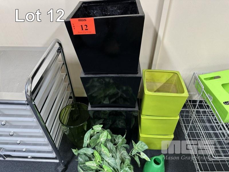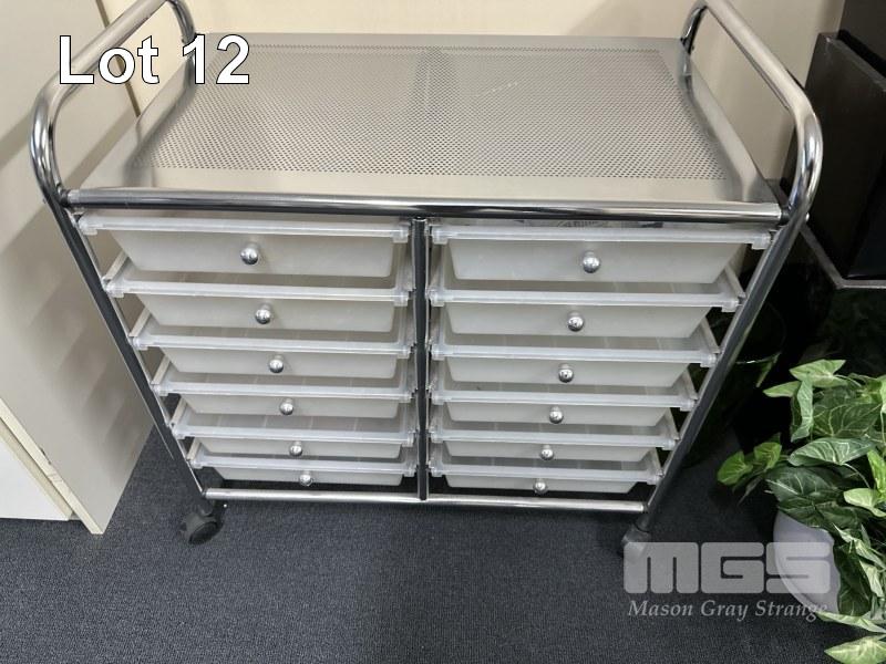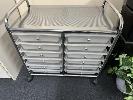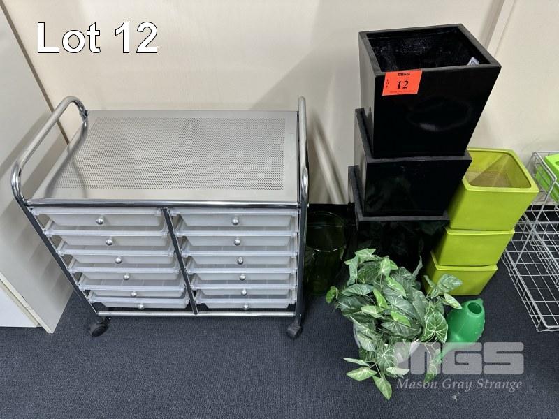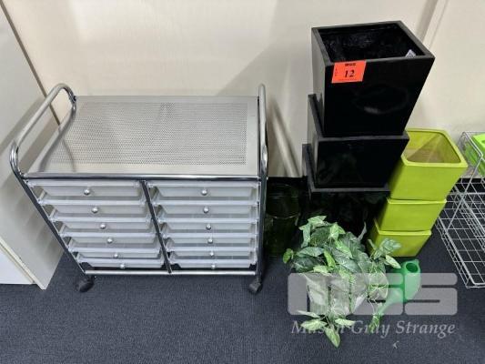 ROLLING STORAGE TROLLEY, 12-DRAWER WITH QTY GARDEN POTS