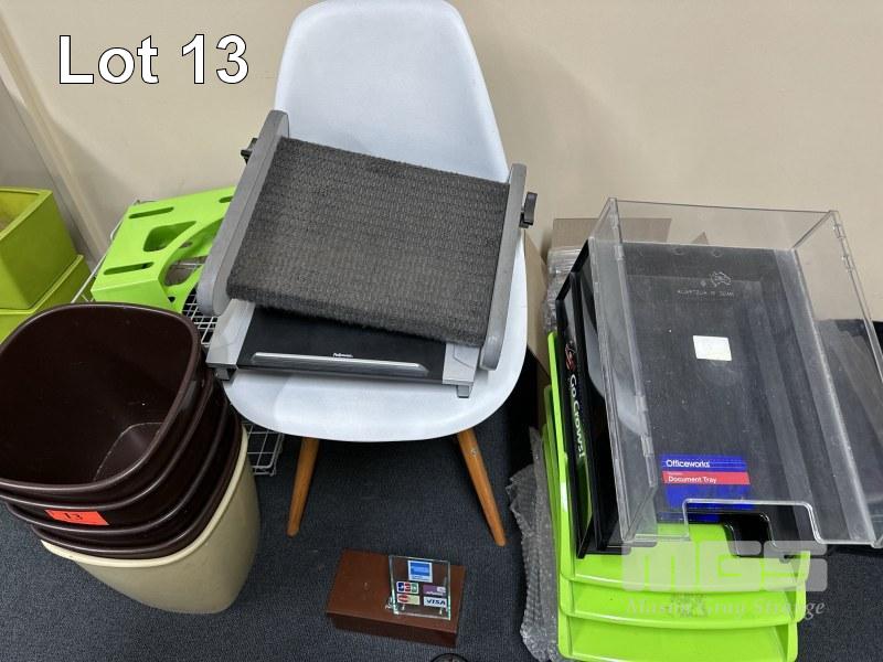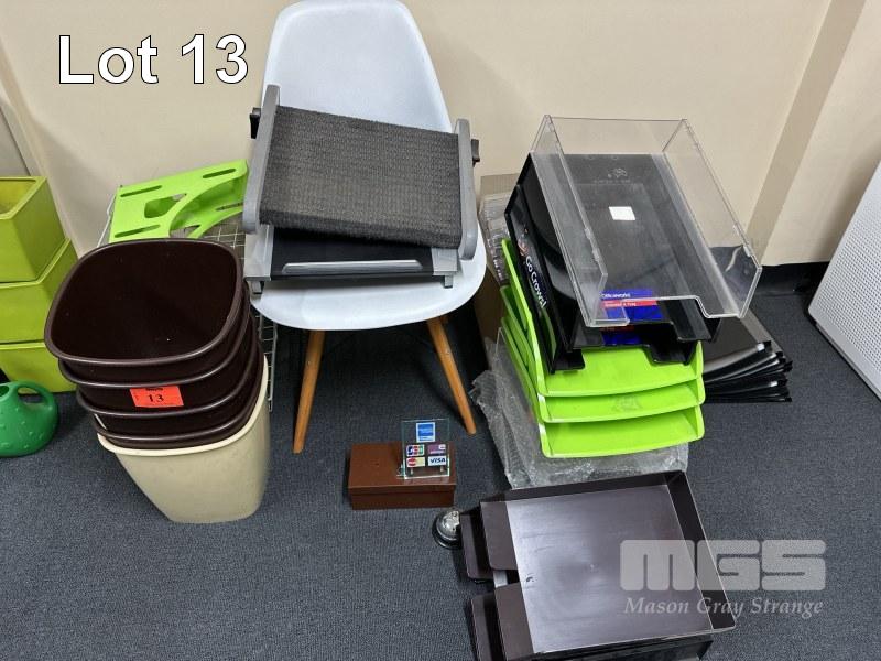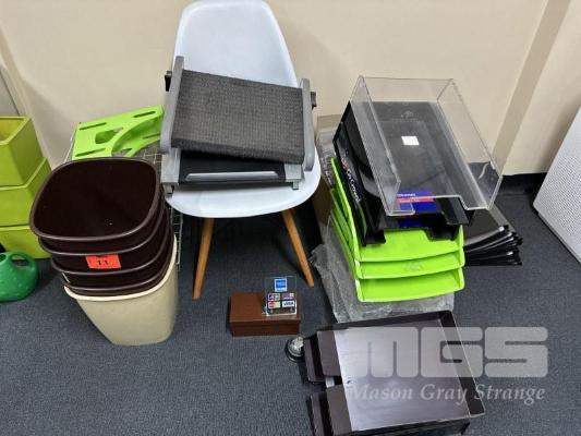 QTY OFFICE SUNDRIES INC CHAIR, BINS, FILE TRAYS, FOOT REST, MONITOR STAND, BUSINESS CARD HOLDERS