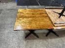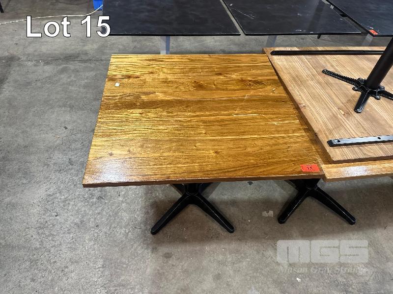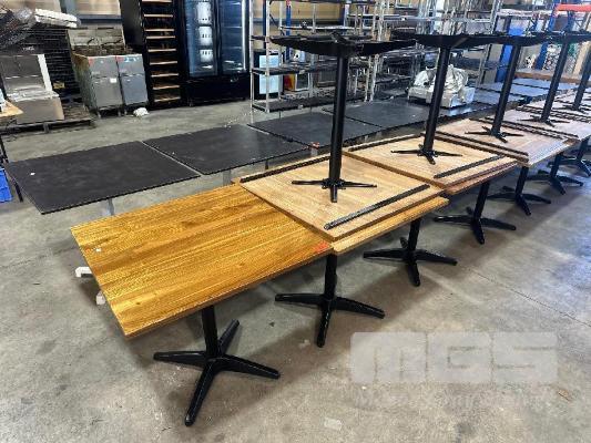 7 x CAFE TABLES, TIMBER TOP, STEEL PEDESTAL BASE
