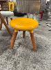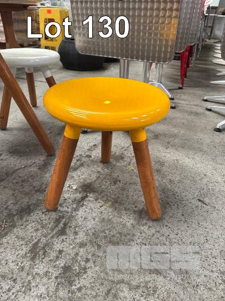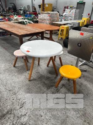 STEEL TOP CIRCULAR CAFE TABLE, WHITE TIMBER LEGS 3 x MATCHING STOOLS WHITE, YELLOW & PINK