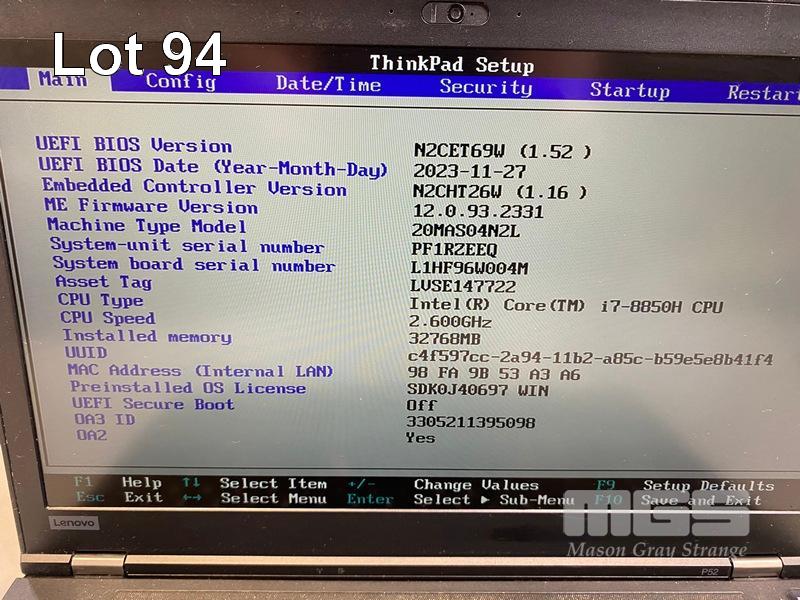 LAPTOP, LENOVO THINKPAD P52 MOBILE WORKSTATION, TYPE 20MA, CORE i7 8850H (8TH GEN) @ 2.6GHz, 32GB DDR4 RAM, 512GB NVMe M.2 SSD, 15.6" WIDESCREEN (1920x1080), 4GB NVIDIA QUADRO P2000 VIDEO, Wi-Fi, BLUETOOTH, WINDOWS 11 PRO INSTALLED & POWER SUPPLY