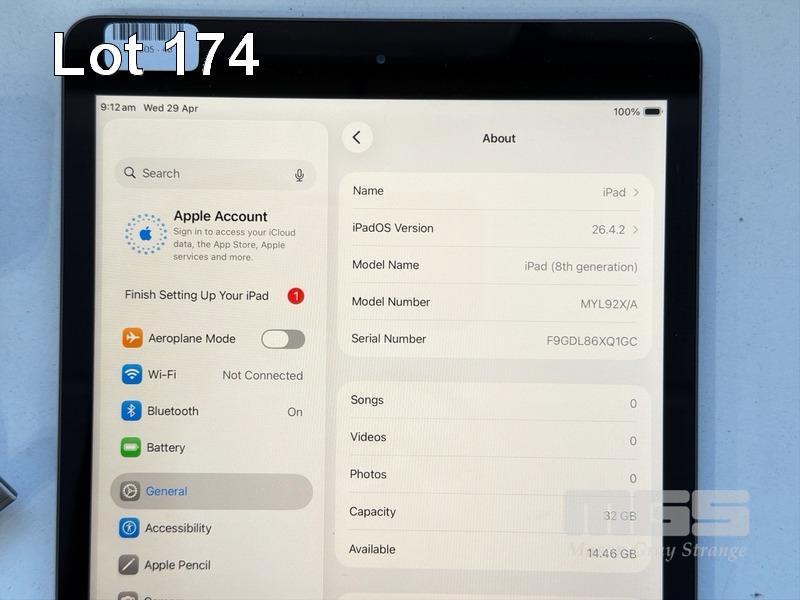 APPLE iPAD 8TH GEN, 32GB, Wi-Fi, SPACE GREY, MODEL MYL92X/A, A2270 WITH CABLE & CHARGER