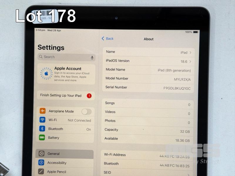APPLE iPAD 8TH GEN, 32GB, Wi-Fi, SPACE GREY, MODEL MYL92X/A, A2270 WITH CABLE & CHARGER