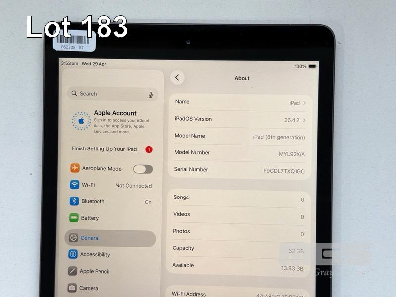 APPLE iPAD 8TH GEN, 32GB, Wi-Fi, SPACE GREY, MODEL MYL92X/A, A2270 WITH CABLE & CHARGER