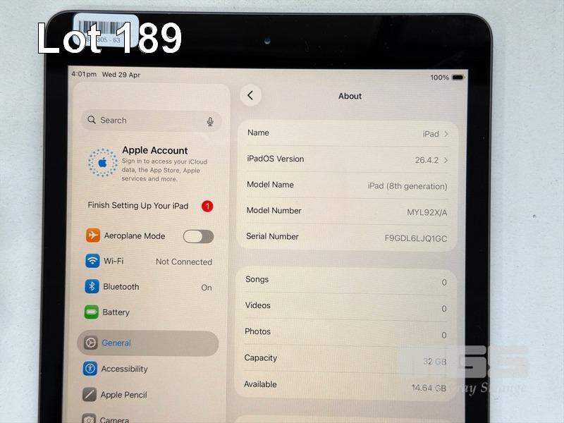 APPLE iPAD 8TH GEN, 32GB, Wi-Fi, SPACE GREY, MODEL MYL92X/A, A2270 WITH CABLE & CHARGER