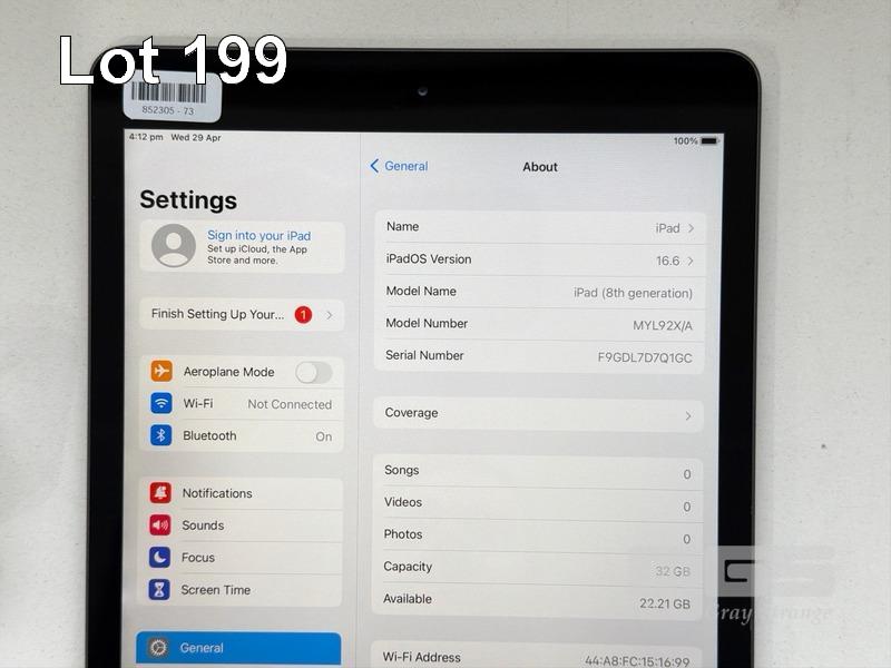 APPLE iPAD 8TH GEN, 32GB, Wi-Fi, SPACE GREY, MODEL MYL92X/A, A2270 WITH CABLE & CHARGER