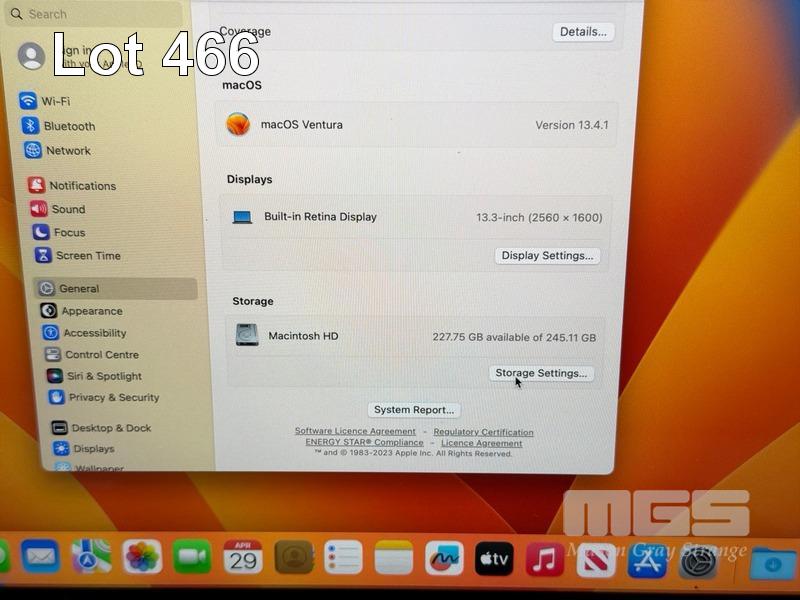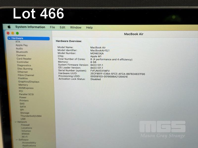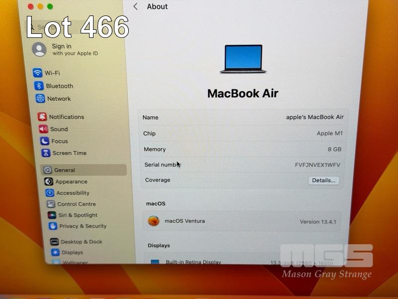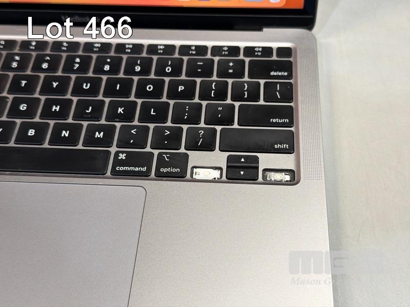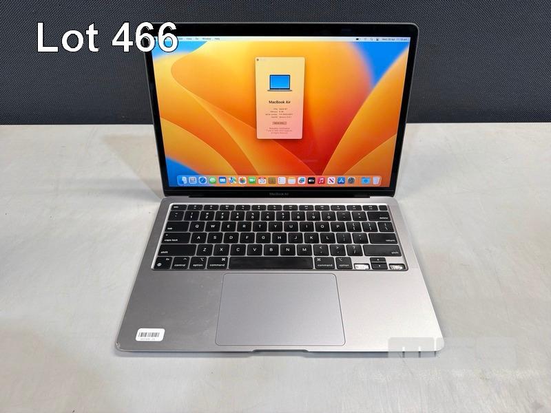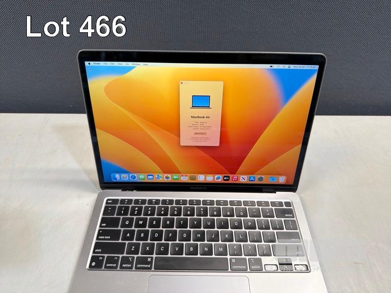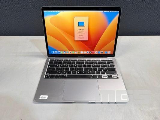 LAPTOP, APPLE MACBOOK AIR (A2337), MGN63X/A, APPLE M1 8 CPU, 7 GPU, 8GB RAM, 256GB SSD, 13.3" RETINA DISPLAY (2560x1600), Wi-Fi, BLUETOOTH, MAC OS 13 INSTALLED (NO USB-C POWER SUPPLY) (NOTE: MISSING 2 x ARROW KEYS, MINOR DENT IN CASING, MINOR MARKS ON SCREEN) S/N:FVFJNVEX1WFV
