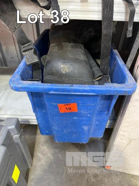 PELICAN TYPE BOX, RATCHET STRAP & TUB OF RUBBER BOOTS