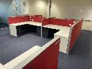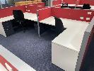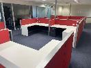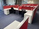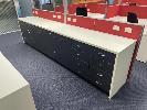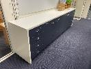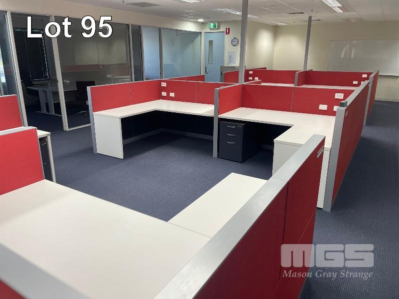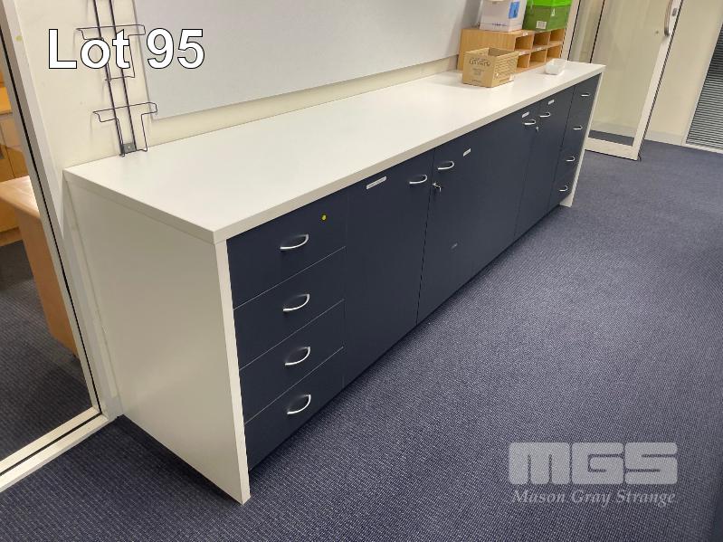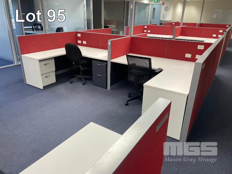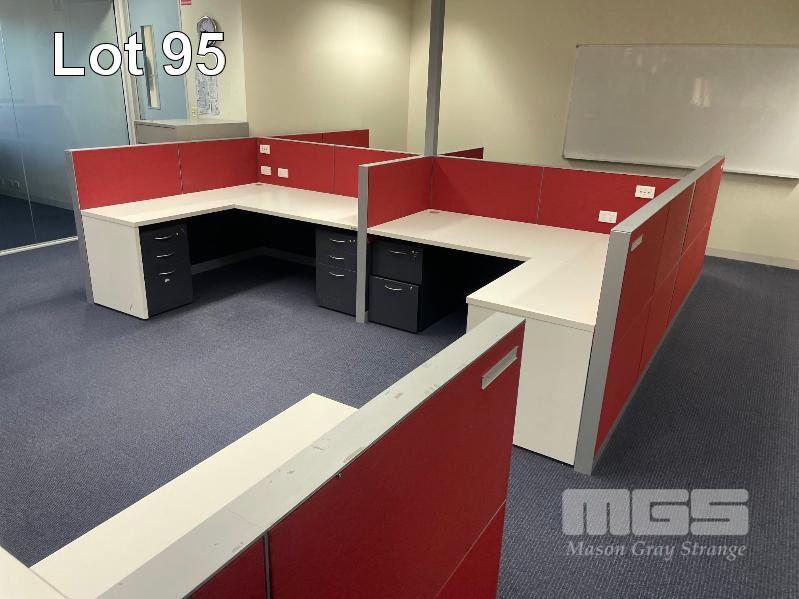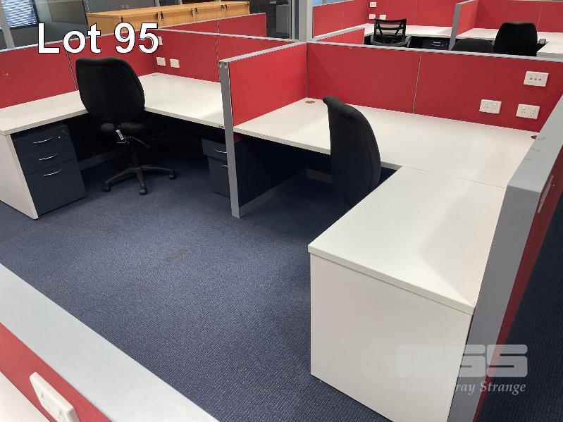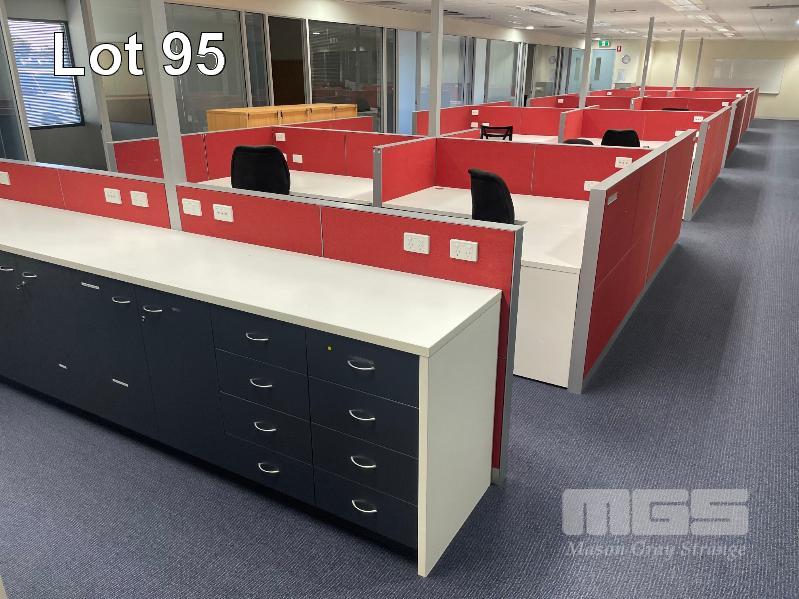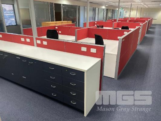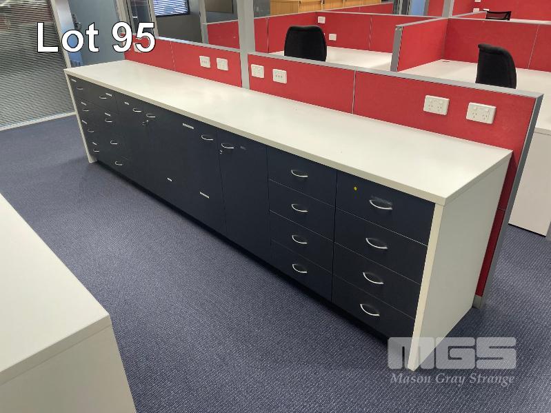 COMPLETE OFFICE BULLPEN: 5 x WORKSTATIONS EACH COMPRISING 4 x DESKS, 1800mm (L), WHITE & DARK GREY TIMBER LAMINATE, EACH WITH GAS LIFT OFFICE CHAIR & 2 x UNDER DESK MOBILES, GPO?s & DATA CABLE OUTLETS, 2 x MATCHING CREDENZAS, 4 DOOR, 16 DRAWER, ELECTRICAL DISCONNECTION REQUIRED.