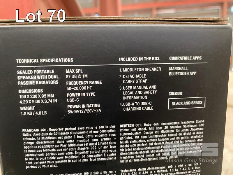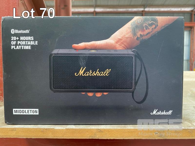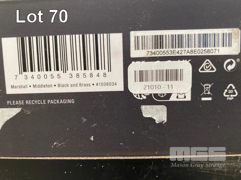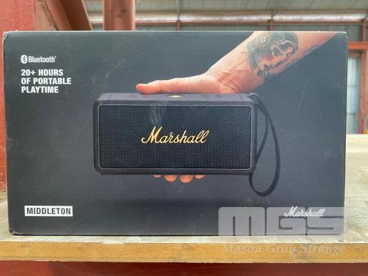 SPEAKER, MARSHALL MIDDLETON PORTABLE BLUETOOTH, BLACK & BRASS (RRP $495) (BOXED) (SUBJECT TO INSURANCE CLAIM) S/N:73400553E427A8E0258071