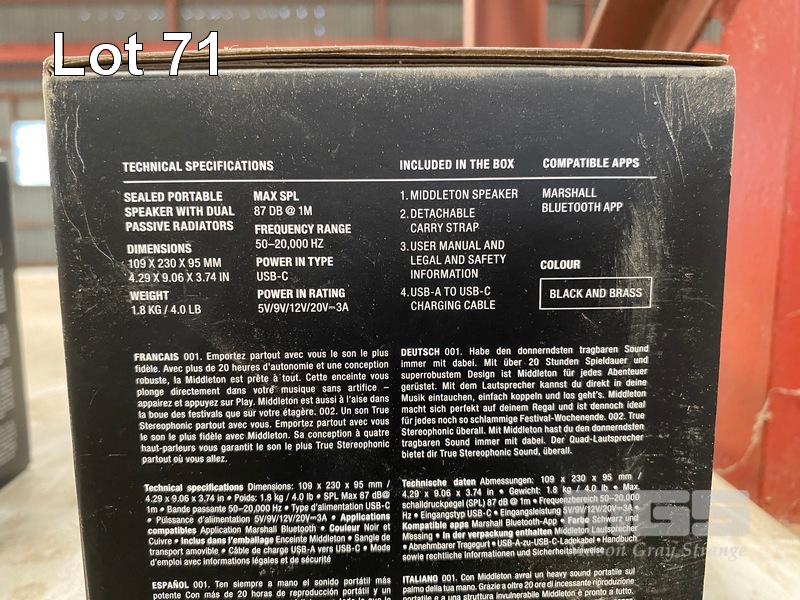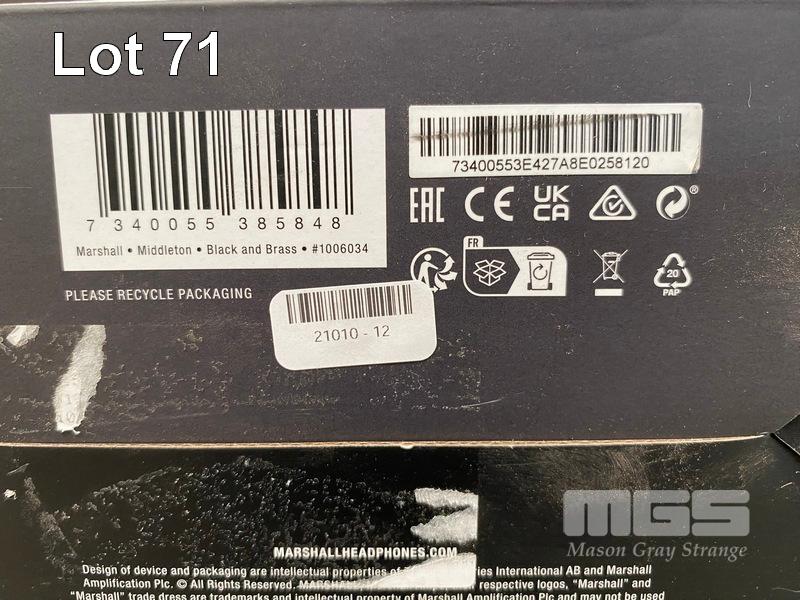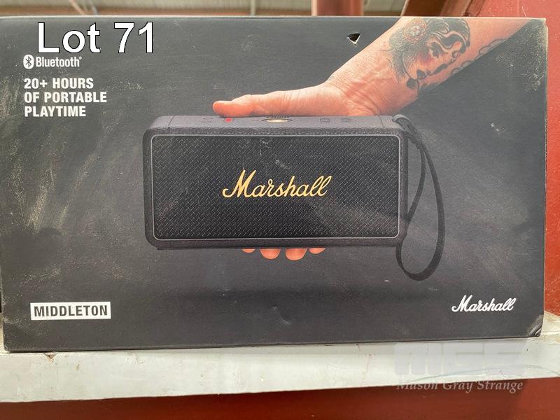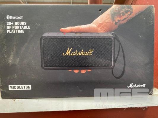 SPEAKER, MARSHALL MIDDLETON PORTABLE BLUETOOTH, BLACK & BRASS (RRP $495) (BOXED) (SUBJECT TO INSURANCE CLAIM) S/N:73400553E427A8E0258120
