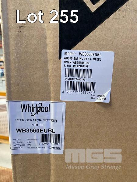 FRIDGE, WHIRLPOOL 313L BOTTOM MOUNT - BLACK STAINLESS STEEL, WB3560EUBL (RRP $1,499) (BOXED) (SUBJECT TO INSURANCE CLAIM) S/N:INE224001921