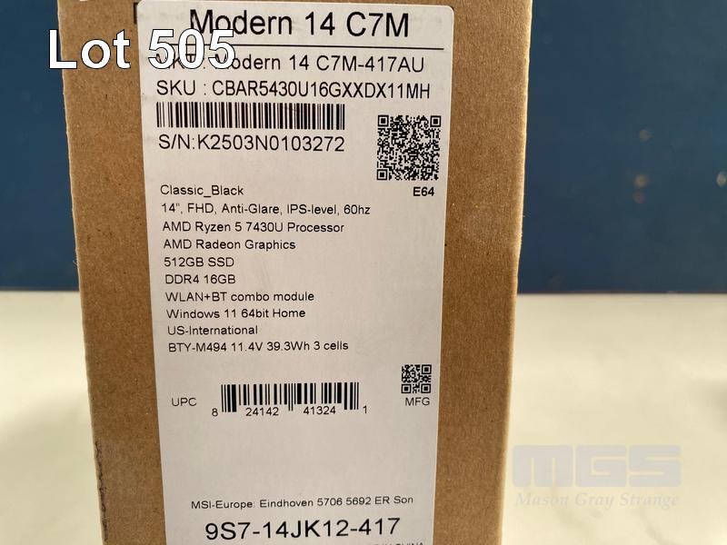 LAPTOP, MSI MODERN 14 C7M-417AU NBK BLACK, AMD RYZEN 5 7430U, 16GB RAM, 512GB SSD, 14 INCH, WINDOWS 11 HOME (RRP $999) (BOXED) (SUBJECT TO INSURANCE CLAIM) S/N:K2503N0103272