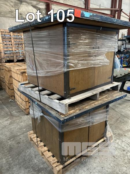 2 x TIMBER WORK BENCHES, 1250 x 1400 x 830mm DOUBLE SIDED WITH CUPBOARDS BOTH SIDES