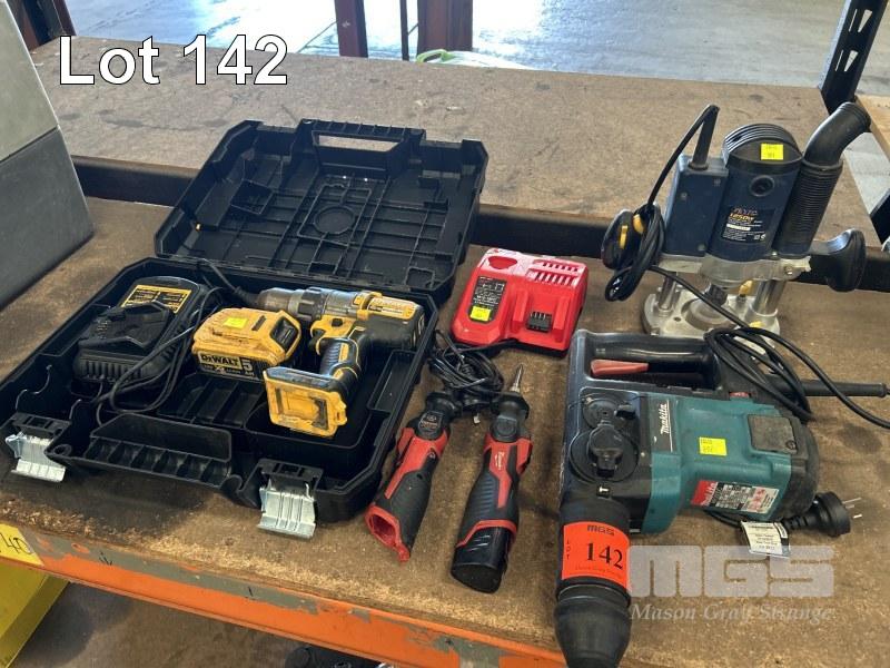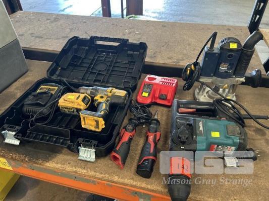 DEWALT BRUSHLESS HAMMER DRILL, 18V, CHARGER, BATTERY & CASE, 2 x MILWAUKEE CORDLESS LITHIUM-ION SOLDERING IRONS, 12V, CHARGER, MAKITA BREAKER DRILL HR3000C, 850w, 240V & GMC 1250w ROUTER, 240V