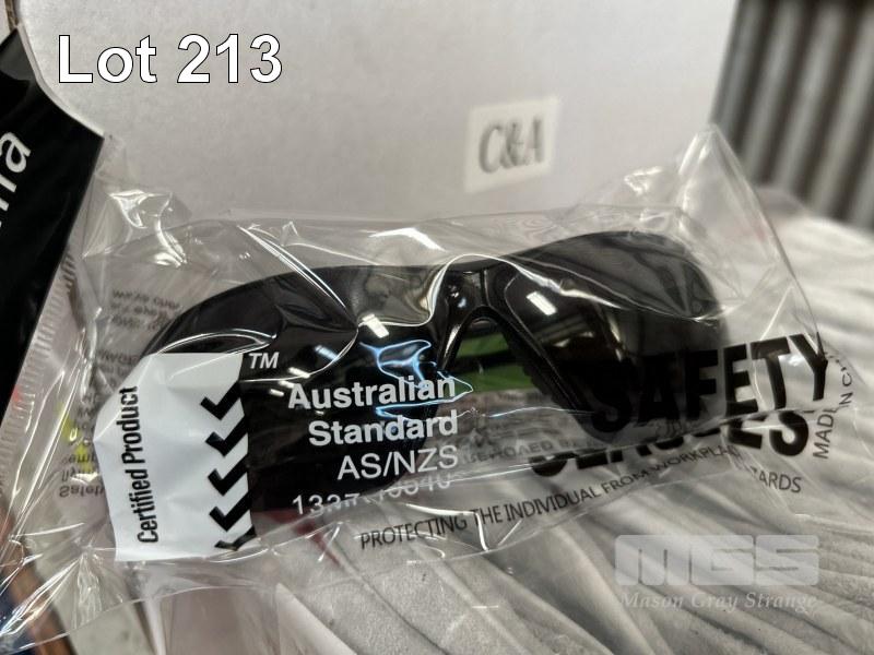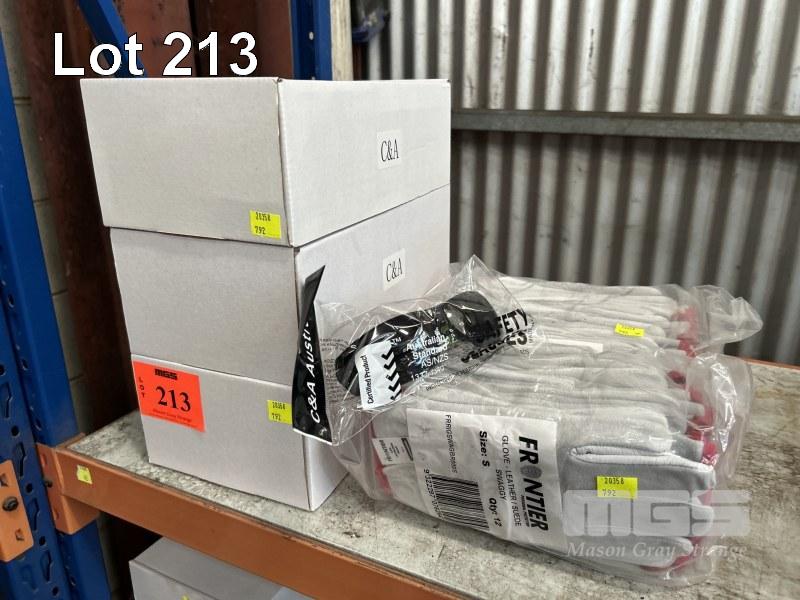 24 x PAIRS, SUEDE GLOVES, FRONTIER, SWAGGY SIZE: SMALL (2 x PACKS) & 36 x PAIRS SAFETY GLASSES, C&A AUSTRALIA, SMOKE 3 x BOXES AS NEW