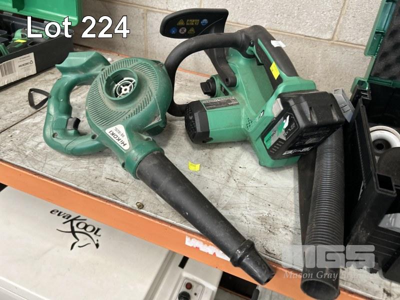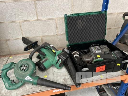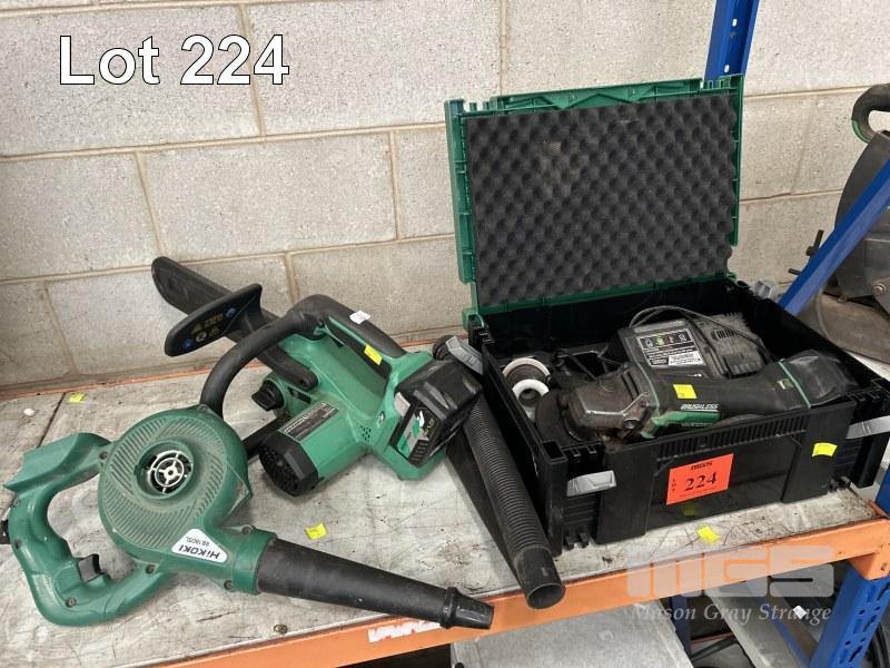 HIKOKI POWER TOOLS INCLUDING ANGLE GRINDER, G18DBL, CHAINSAW, CS3630DA & BLOWER, 2 x BATTERIES & CHARGER