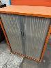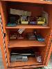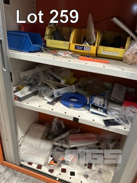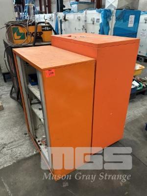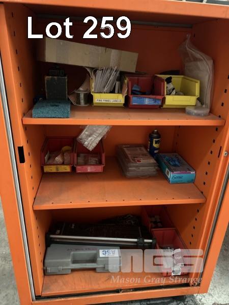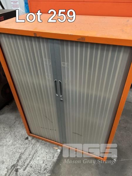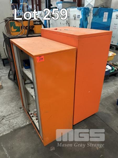 2 x STATIONERY CABINETS, SLIDING ROLLER DOORS, ORANGE STEEL, 900 x 460 x 1220mm (H), 1 HAS DAMAGED DOORS & CONTENTS ELEC TAPE, STATIONARY, ETC