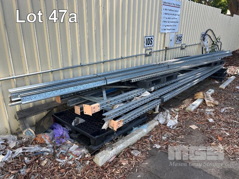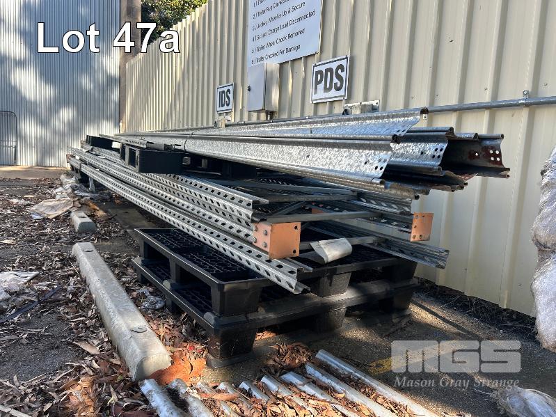 44 x BAYS COLBY PALLET RACKING COMPRISING, 50 x UPRIGHTS, FROM 4850mm (H) - 6000mm (H), (UPRIGHTS HAVE BEEN CUT TO VARIOUS HEIGHTS TO SUIT WAREHOUSE) 266 x CROSS BEAMS, 2600mm, 12 x CROSS BEAMS, 1400mm, POST GUARDS, 6 x BAYS WITH EXTENDED DEPTH & SAFETY MESH INCLUDING ASSORTED UPRIGHTS & CROSSBEAMS IN REAR YARD 2 x PALLETS. PALLET RACKING IS LOCATED AT 386 TORRENS ROAD KILKENNY SA (NEXT DOOR TO MGS) PLEASE NOTE: IT IS THE PURCHASERS RESPONSIBILTY TO DISMANTLE & REMOVE PALLET RACKING ALL RACKING MUST BE REMOVED WITHIN 5 BUSINESS DAYS OF SALE. A FORK LIFT & SAFETY CAGE IS AVAILABLE FOR HIRE FROM MGS FOR A NOMINAL FEE. DRIVER MUST HAVE FORKLIFT LICENSE
