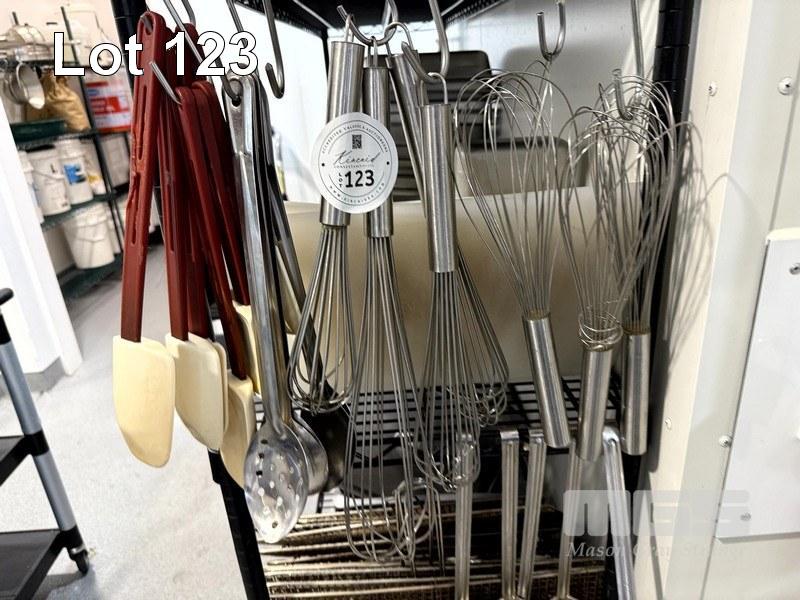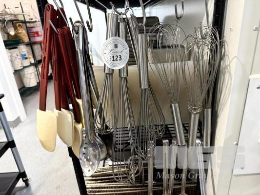 QUANTITY OF ASSORTED STAINLESS-STEEL WHISKS & TONGS